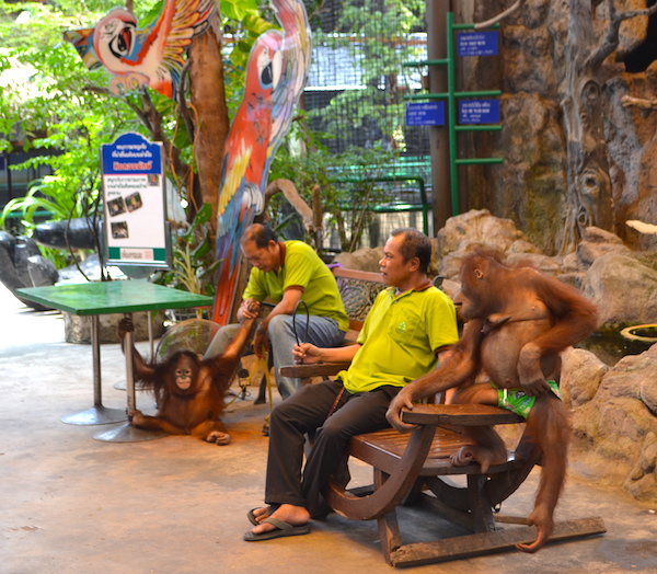 Young orangutans of unknown origin sit outside the Pata Zoo to be used as money earning photo props
