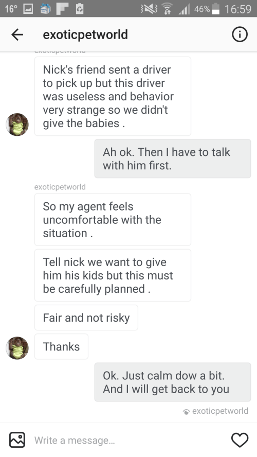 On 2nd December I WhatsApped R. at Freeland: “Exoticpet88 is back and showing the kids.”