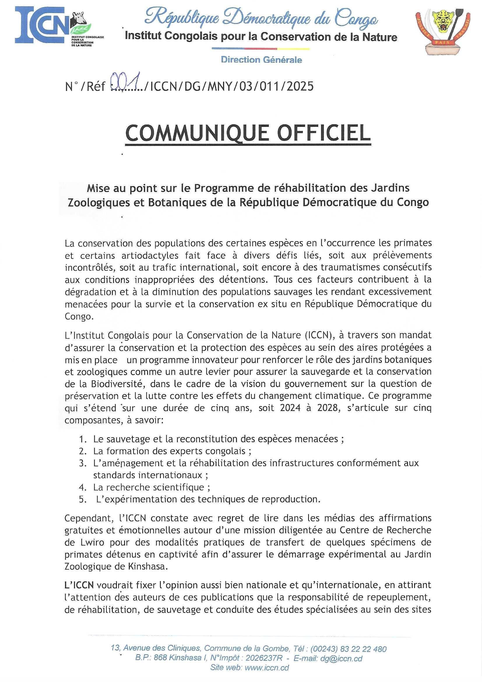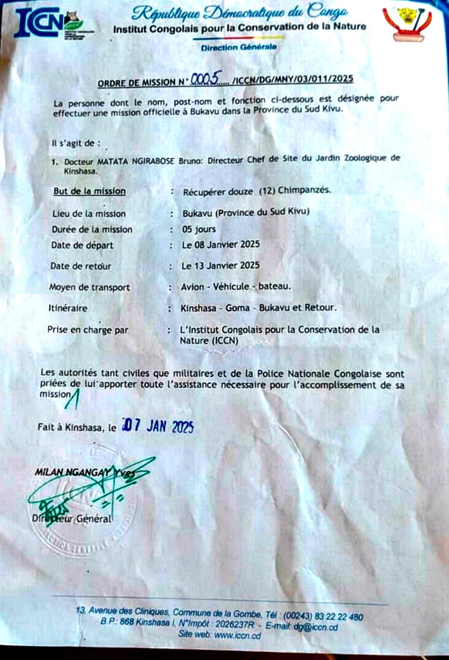 The letter was signed by Yves Milan Ngangay, Director General of ICCN, which is also responsible for the nation’s sanctuaries and public zoos.