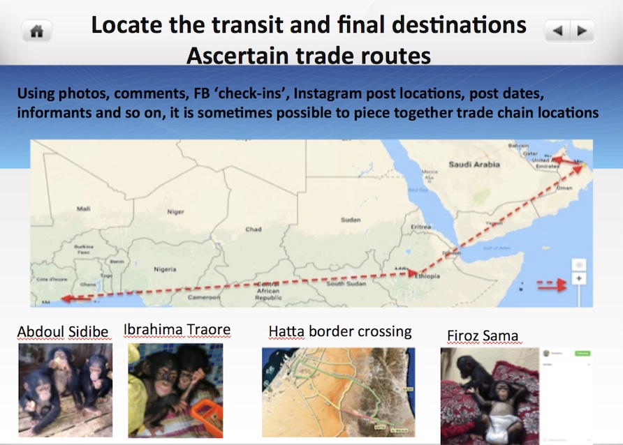 One of the online traffickers PEGAS has been monitoring, located in Qatar, posted a video on 18 February of the baby chimpanzee that was later seized. The pajamas are identical with those in the newspaper report and the size and facial characteristics of the infant in the photograph and video are the same.