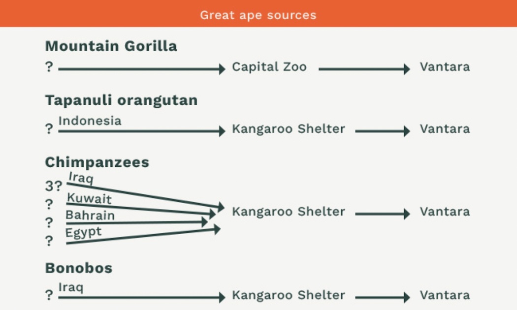 While KASC exported 46 chimpanzees to Vantara, CITES reported that only 30 had been imported to the UAE by the end of 2023. None of the chimps arriving at KASC had their origins declared to CITES, barring three that arrived in Iraq from Germany in 2022 and the Tapanuli orangutan from an unknown source in Indonesia.
